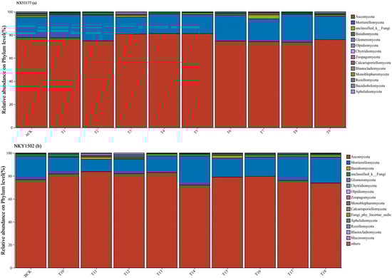 Relative abundance of rhizosphere soil fungi at the phylum level. (a) NX53177, (b) NKY1502.