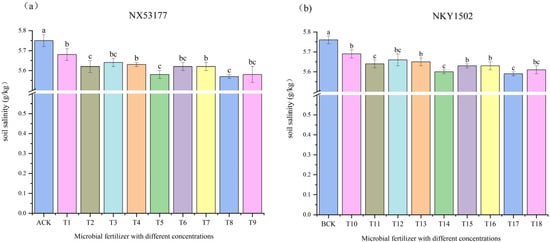 Effects of different concentrations of microbial fertilizers on sunflower soil salinity. (a) NX53177, (b) NKY1502. Different letters indicate statistically significant differences at p < 0.05.