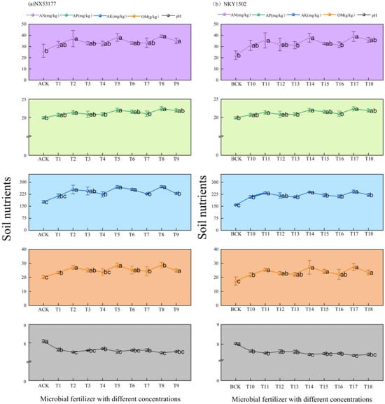 Effects of different concentrations of microbial fertilizers on sunflower soil nutrient content. (a) NX53177, (b) NKY1502. Different letters indicate statistically significant differences at p < 0.05.