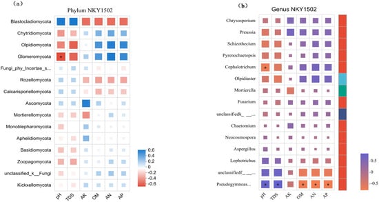 Spearman correlation heatmap of environmental factors and fungal community composition for the NKY1502 variety. (a) Phylum level. (b) Genus level. The X-axis and Y-axis represent environmental factors and fungal groups, respectively. Correlation R and p values were calculated. * Indicates 0.01 < p < 0.05.