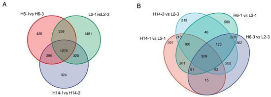 Venn diagram of differentially expressed genes (DEGs) of 22HL6, 22HL14 and 22HL2 during germination. (A): DEGs identified across different germination stages within each genotype (H6, H14, and L2); (B): DEGs identified from comparisons between genotypes at the same germination stage (24 h and 72 h).