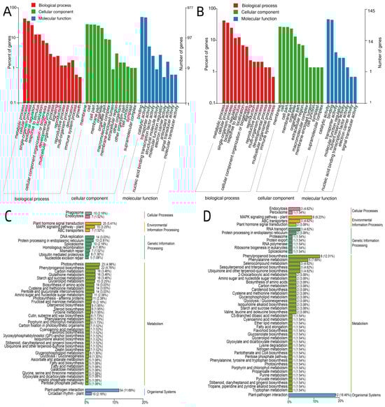 GO enrichment analysis (A,B) and KEGG pathway enrichment analysis (C,D) of differentially expressed genes (DEGs).