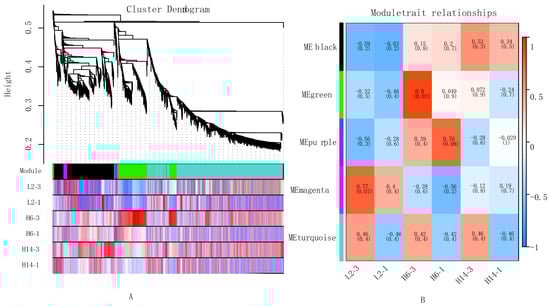 To further investigate the functional relationships and regulatory networks among genes involved in pepper seed germination, a weighted gene co-expression network was constructed using 1886 rigorously selected DEGs. Clustering analysis based on the FPKM values of these genes grouped those with similar expression patterns into the same module. In the resulting dendrogram, distinct branches represented different gene co-expression modules, each marked by a unique color (Figure 6A). A total of five modules were identified: black, green, purple, magenta, and turquoise. A heatmap of module–sample correlations was generated, and subsequent module–trait association analysis (Figure 6B) revealed that gene expression patterns in the black module were positively correlated with germination speed in H14 and H6 but negatively correlated in L2.
