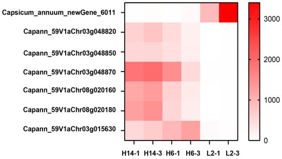 Additionally, expression levels and functional annotations of the 309 DEGs shared across four comparison groups (H14-1 vs. L2-1, H14-3 vs. L2-3, H6-1 vs. L2-1, and H6-3 vs. L2-3) were analyzed (Figure 7). Seven genes exhibiting significant differential expression were identified. Notably, Capsicum_annuum_newGene_6011 was highly expressed in L2, with expression levels exceeding 100-fold higher than in H6 and H14. Conversely, Capann_59V1aChr03g048820, Capann_59V1aChr03g048850, Capann_59V1aChr03g048870, Capann_59V1aChr08g020160, Capann_59V1aChr08g020180, and Capann_59V1aChr03g015630 were highly expressed in H6 and H14, with expression levels more than 100-fold greater than in L2. Integrating DEG expression patterns, annotation data, and prior literature, Capann_59V1aChr03g048850 was selected as the key candidate gene for further functional validation.