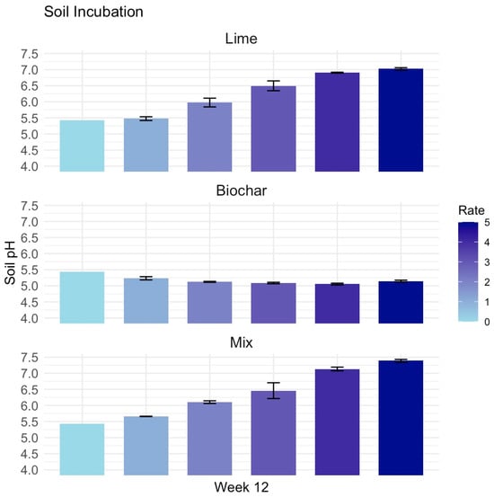 At week 12, soil pH measurements revealed distinct differences among treatments. Lime application significantly increased soil pH in a clear dose-dependent manner (p < 0.001), with the highest rate reaching values above 7.0 (Figure 2). In contrast, biochar had a minimal effect on soil pH, with little change observed across rates. The lime–biochar combination produced a pH response similar to lime alone, indicating that lime dominated the pH effect even when applied in combination with biochar.