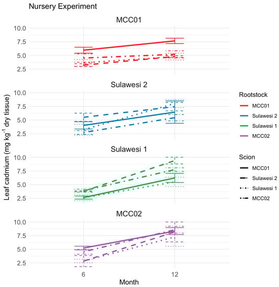 Our results present a twelve-month nursery experiment testing various scion and rootstock combinations of the clones MCC01, MCC02, Sulawesi 1, and Sulawesi 2 for changes in leaf Cd concentrations (Figure 5). At the six-month mark, just prior to the injection of Cd solution, leaf Cd levels were relatively low across all combinations, ranging from less than 2.5 to greater than 5.0 mg kg−1. After the Cd solution was injected, leaf Cd levels increased across all scion-rootstock combinations by the twelve-month sampling. Notably, leaf Cd accumulation varied depending on the combination of scion and rootstock used (Figure 5).