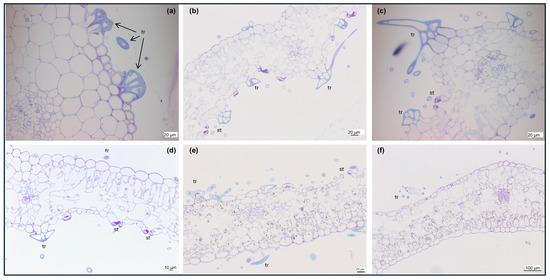 Light micrographs of toluidine blue-stained section of in vitro C. heterophyllus subsp. carthaginensis leaves fixed without (a–c) or with (d–f) caffeine from control (a,d), 10 μM SA (b,e), and 100 μM SA (c,f)-treated shoots. Abbreviations: tr, trichome; st, stomata.
