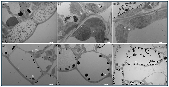 Transmission electron micrographs (TEMs) of C. heterophyllus subsp. carthaginensis leaves fixed without (a–c) or with (d–f) caffeine from control (a,d), 10 μM SA (b,e), and 100 μM SA (c,f)-treated shoots. Abbreviations: C, chloroplast; M, mitochondrion; N, nucleus; Ph, electro-dense deposit of phenolic compounds; Pg, plastoglobuli.