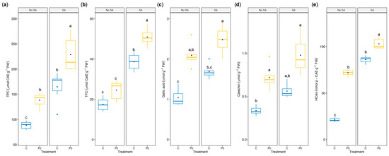 Effect of SA pretreatment (100 μM) on total soluble phenols (TPC) (a), flavonoids (TFC) (b), gallic acid (c), catechin (d), and HCAs (e) in C. heterophyllus subsp. carthaginensis in vitro shoots exposed for 7 days to either 100 μM KNO3 (control) or 50 μM Pb(NO3)2. Gallic acid, catechin, and HCA contents were determined using reverse-phase HPLC-DAD. Boxplots show the median (horizontal line), the mean (black dot), the interquartile range (box), and whiskers extending to 1.5× IQR. Data are based on two independent experiments, each with three biological replicates of three pooled shoots (n = 6). Different letters indicate significant differences among treatments (p ≤ 0.05; Kruskal–Wallis test and pairwise post hoc Dunn–Bonferroni test).