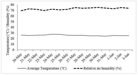 The experiment was conducted in a growth room at the Microalgae and Biotechnology Laboratory, located at the State University of Mato Grosso do Sul (UEMS) in Cassilândia, MS, Brazil (19°05′46″ S and 51°48′50″ W, with an altitude of 521 m). During the experiment, temperature and relative humidity conditions were recorded using a datalogger. The average temperature throughout the experimental period was 27 °C, and the relative humidity was approximately 72% (Figure 1).
