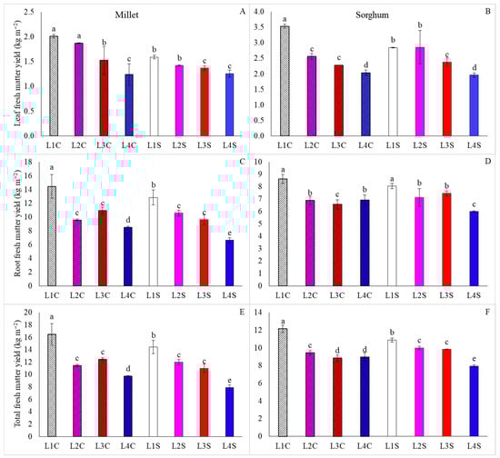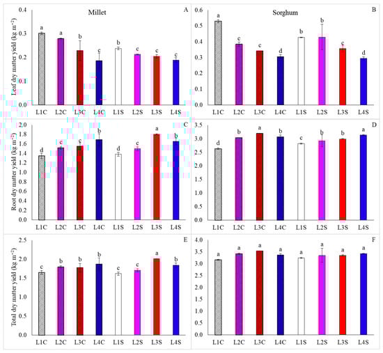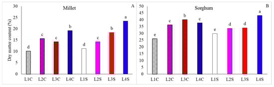 For millet, L3S resulted in the highest total dry matter yield, while L1C, L1S, and L2S indicated a reduction in these characteristics (Figure 5E). In contrast, for the total dry matter yield in sorghum, no differences were evident between treatments (Figure 5D). However, for both species, higher dry mass contents were obtained in L4S, whereas the lowest results were found for plants grown under L1 (Figure 6).