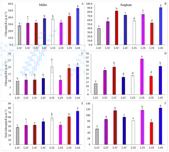 In millet, the highest chlorophyll a content was found in plants under L4S, followed by a combination of L4C, L1S, and L3S (Figure 7A). Additionally, the highest chlorophyll b and total contents in millet were observed in plants grown under L1S, L3S, and L4S, which outperformed the other treatments in both characteristics, with particular emphasis on L4S regarding total chlorophyll content (Figure 7C,E).