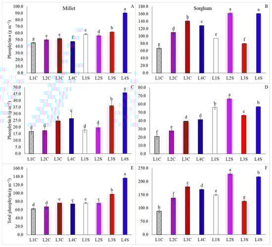 Pheophytin a, pheophytin b and total pheophytin content in millet (A,C,E) and sorghum (B,D,F) plants, grown as hydroponic green fodder, under different lighting conditions and nicotinamide applications. L1 = increased full spectrum LED; L2 = ultraviolet LED; L3 = red LED; L4 = blue LED; C = with nicotinamide; S = without nicotinamide; bars represent the treatment mean ± standard error; different letters above the mean bars indicate significant difference by the Scott–Knott test at 5% probability.