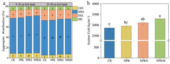 Soil aggregate fractions (a) and soybean yield (b) under different fertilization regimes in 0–20 cm and 20–40 cm layers. CK, unfertilized control; NPK, chemical fertilizer; NPKS, NPK plus straw; NPKM, NPK plus organic manure. LMA, >2 mm; MMA, 2–0.25 mm; SMA, 0.25–0.053 mm; MIC, <0.053 mm. Distinct lowercase letters denote significant differences (p < 0.05), and error bars show standard deviations (n = 3).
