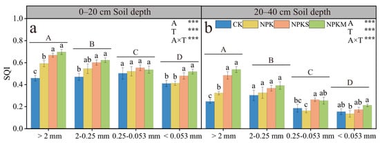 SQI in aggregate scale in 0–20 cm (a) and 20–40 cm (b) soil layers. CK, unfertilized control; NPK, chemical fertilizer; NPKS, NPK plus straw; NPKM, NPK plus organic manure. LMA, >2 mm; MMA, 2–0.25 mm; SMA, 0.25–0.053 mm; MIC, <0.053 mm. SQI, soil quality index; A, aggregate size; T, treatment; A × T, interaction between aggregate size and treatment. Uppercase letters indicate differences among aggregate size fractions, and lowercase letters denote significant treatment effects (p < 0.05). Bars indicate standard deviations (n = 3). ***, p < 0.001.