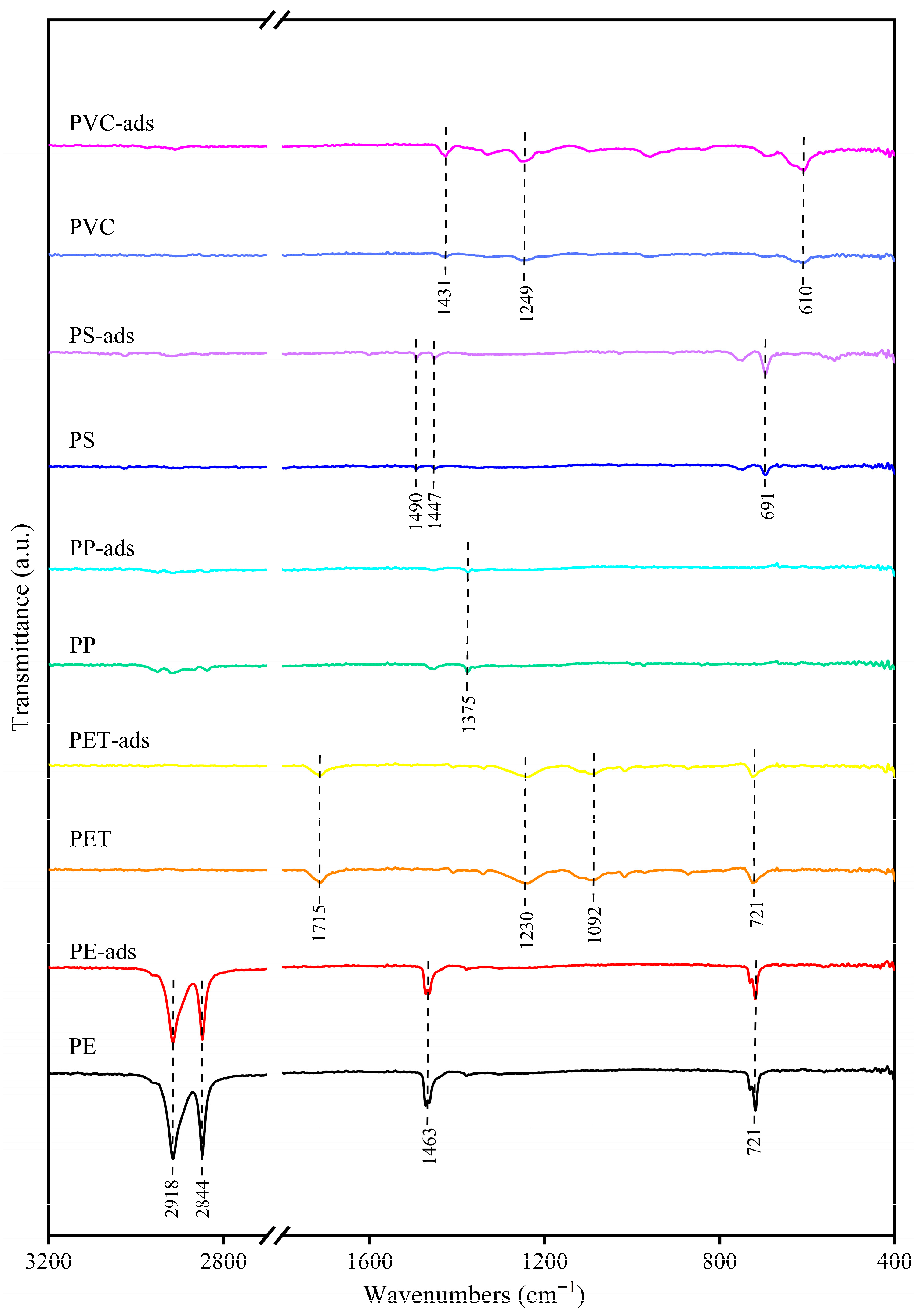 3.1.2. Fourier-Transform Infrared (FTIR) Analysis of PFOA Adsorption by MPs