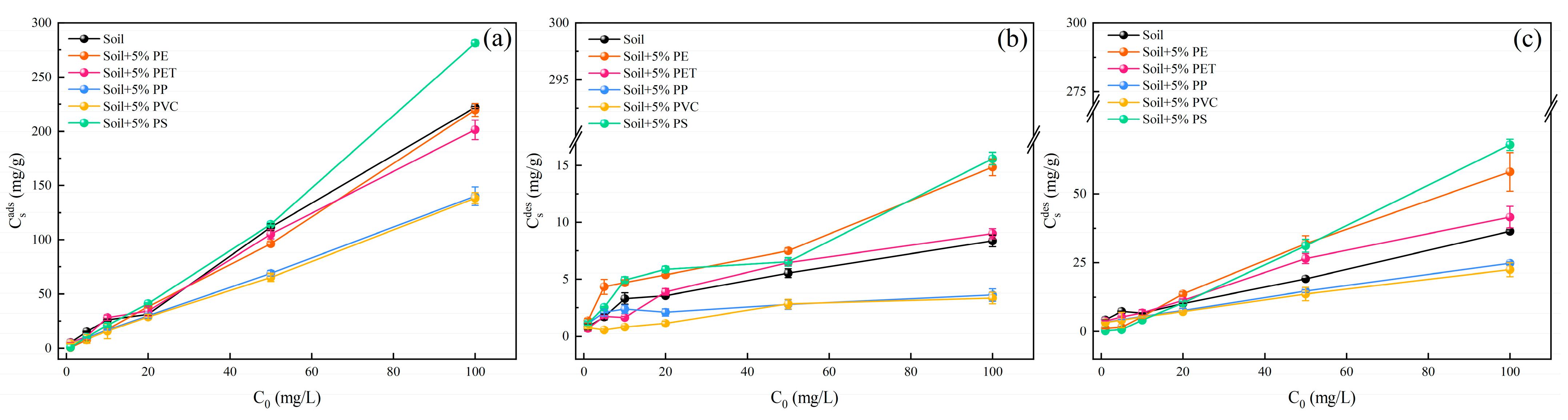 3.3.2. Adsorption and Desorption Isotherms of PFOA by MPs and Soil