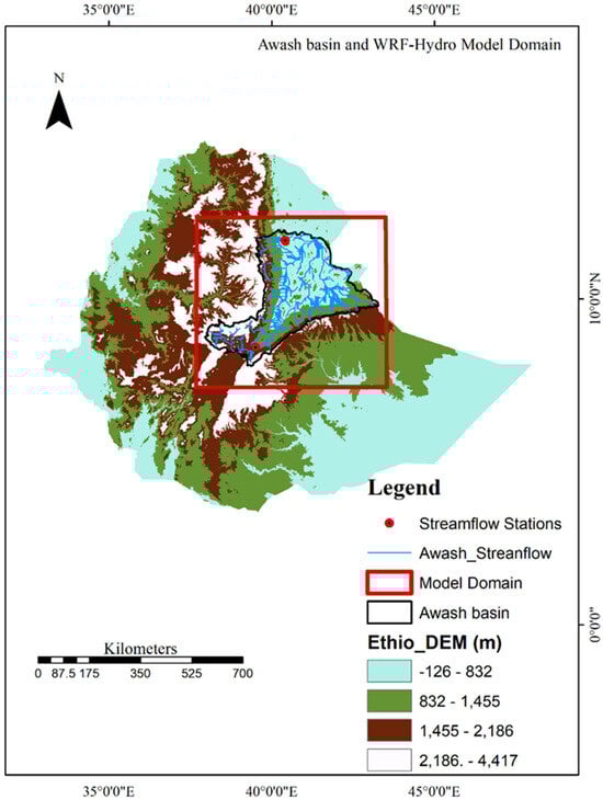 The Awash Basin, located in the central part of Ethiopia (approximately 8–12° N, 38–43° E), is one of the most significant and critically stressed river basins in the Horn of Africa [4]. At a continental scale, it represents a quintessential example of a semi-arid to arid river system in East Africa, where water resources are under intense pressure from rapid population growth, agricultural development, and climate variability [32]. As a closed basin with no outlet to the sea, its hydrological dynamics are particularly sensitive to internal changes, making it a critical case for studying land-water interactions. The Awash Basin spans diverse climatic zones, ranging from humid highlands to arid lowlands, covering approximately 110,000 km2. The basin is critical for agriculture, water supply, and hydroelectric power generation [7]. Characterized by seasonal rainfall variability and prolonged dry periods, the basin faces over-extraction, salinization, and declining water quality challenges. The basin’s topography is complex, with elevations ranging from over 4000 m in the highlands to below sea level in the lowlands. This variation in elevation contributes to a wide range of climatic conditions, from temperate conditions in the highlands to hot, dry conditions in the lowlands [6]. The complex topography and diverse land use, including forests, grasslands, and urban areas, further complicate hydrological processes, making it an ideal case study for evaluating advanced coupled models. The basin experiences significant seasonal rainfall variability, with most precipitation occurring during the primary rainy season (Kiremt) from June to September [33]. This variability and prolonged dry periods challenge water resource management and agricultural productivity [25]. The Awash Basin in Ethiopia exhibits a diverse climate, ranging from humid subtropical in the highlands to arid conditions in the lowlands [25]. This variability significantly influences precipitation patterns across the basin. The upper basin receives substantial rainfall, often exceeding 1200 mm annually, with a bimodal distribution: a short rainy season from March to May and the main rains from June to September [24]. In contrast, the lower basin receives much less rainfall, typically below 100 mm per year [24]. Climate change is projected to exacerbate these differences, with models suggesting a decrease in runoff due to warmer, drier conditions, potentially reducing water availability by 10–34% across different scenarios [6].