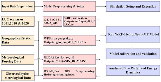 Integrating remote sensing with advanced ecohydrological models offers a powerful approach to overcome data scarcity and provide comprehensive, spatially explicit assessments of water and energy fluxes [19]. Satellite-based observations and products, such as those from the Global Land Data Assimilation System (GLDAS), enable continuous monitoring of hydrological parameters at large spatial scales, which is essential for capturing the impacts of climate and land cover dynamics [20]. In this context, the coupled WRF-Hydro/Noah-MP model emerges as a robust tool. WRF-Hydro, a distributed hydrological model extension of the Weather Research and Forecasting model, integrates atmospheric dynamics with surface and subsurface hydrology [21]. Coupled with the Noah-MP land surface model, which includes multiple parameterization options for vegetation and soil processes, this framework can significantly enhance the simulation of water balance components and energy fluxes across complex terrains [22,23].