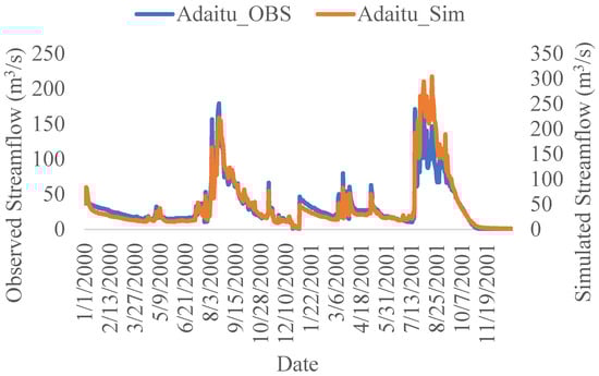 Linear regression of observed and simulated Adaitu streamflow (2000–2001).