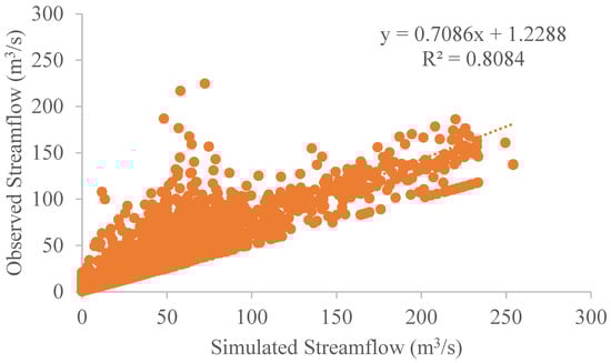 The WRF-Hydro/NoahMP model can simulate streamflow dynamics within the Awash Basin. Time series plots at Metehara (Figure 3) and Adaitu (Figure 4) stations indicate that the model effectively captures seasonal variability and the timing of major runoff events, closely aligning with observed hydrographs [64]. Notably, the scatter plots reveal strong correlations between observed and simulated streamflow, with R2 values of 0.80 at Metehara (Figure 5) and 0.89 at Adaitu (Figure 6), underscoring the model’s ability to explain a substantial portion of the variance in daily streamflow. These results affirm the model’s proficiency in representing the basin’s key hydrological processes, including rainfall-runoff transformation and flow routing.