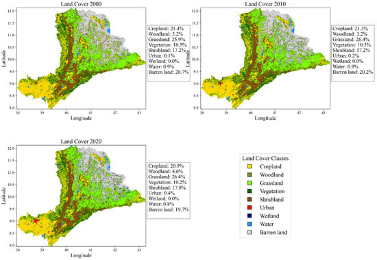 To assess the impact of land use change (LUC) on hydrological processes in the Awash Basin, this study integrates three distinct land use scenarios for 2001, 2010, and 2020. These scenarios depict the evolution of land cover over two decades, with each year capturing a snapshot of land use at that time. The 2001 scenario serves as the baseline, representing the initial land use conditions and helping establish a reference for comparison. The 2010 scenario reflects mid-term land use changes, marking the intermediate phase of anthropogenic and natural shifts in land cover [55]. Finally, the 2020 scenario captures the most recent land use dynamics, highlighting the effects of urbanization, agricultural expansion, and other human-induced transformations [56]. Using remote-sensing-derived land use data, this study enables advanced analysis of LUCC scenarios, incorporating high-resolution satellite imagery and spatial data to quantify land cover changes over time [57]. This remote sensing integration significantly enhances the precision of land use change detection and its impacts on hydrological and energy fluxes, providing a robust methodology for assessing the influence of evolving land use on water resources across the Awash Basin [58,59].