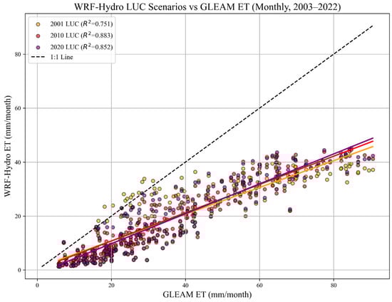 WRF-Hydro LUC Scenarios vs. GLEAM ET (2003–2022).