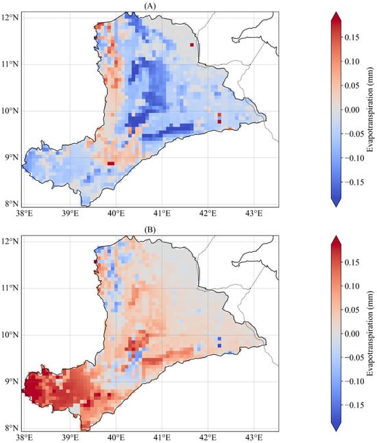 Spatial change maps of evapotranspiration under (A) 2020–2010 and (B) 2010–2001 LUC scenarios.