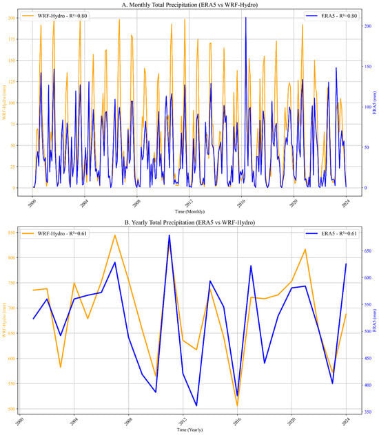 Model calibration and validation are critical to assess the accuracy of the WRF-Hydro model in simulating streamflow and overall water balance components. Observed streamflow data from in situ monitoring stations were used to calibrate and validate the model. Model performance was evaluated using statistical metrics such as the Nash-Sutcliffe Efficiency (NSE), Root Mean Square Error (RMSE), and Bias [67,68]. These metrics help assess how well the model replicates observed streamflow and identify discrepancies in simulated water balance components. This validation process ensures that the WRF-Hydro model provides reliable simulations for water yield and extreme event prediction. Streamflow data, measured at gauging stations, are critical for validating model simulations of river discharge and assessing the overall water balance within basins [65,69,70].