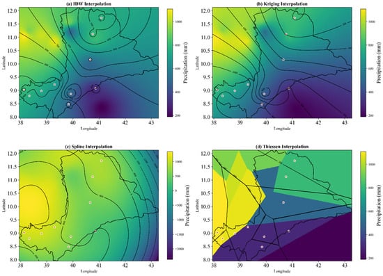 Furthermore, to analyze the spatial relationship between precipitation and elevation, we utilized multiple spatial interpolation techniques on observed station data (1990–2021). We compared four common methods: