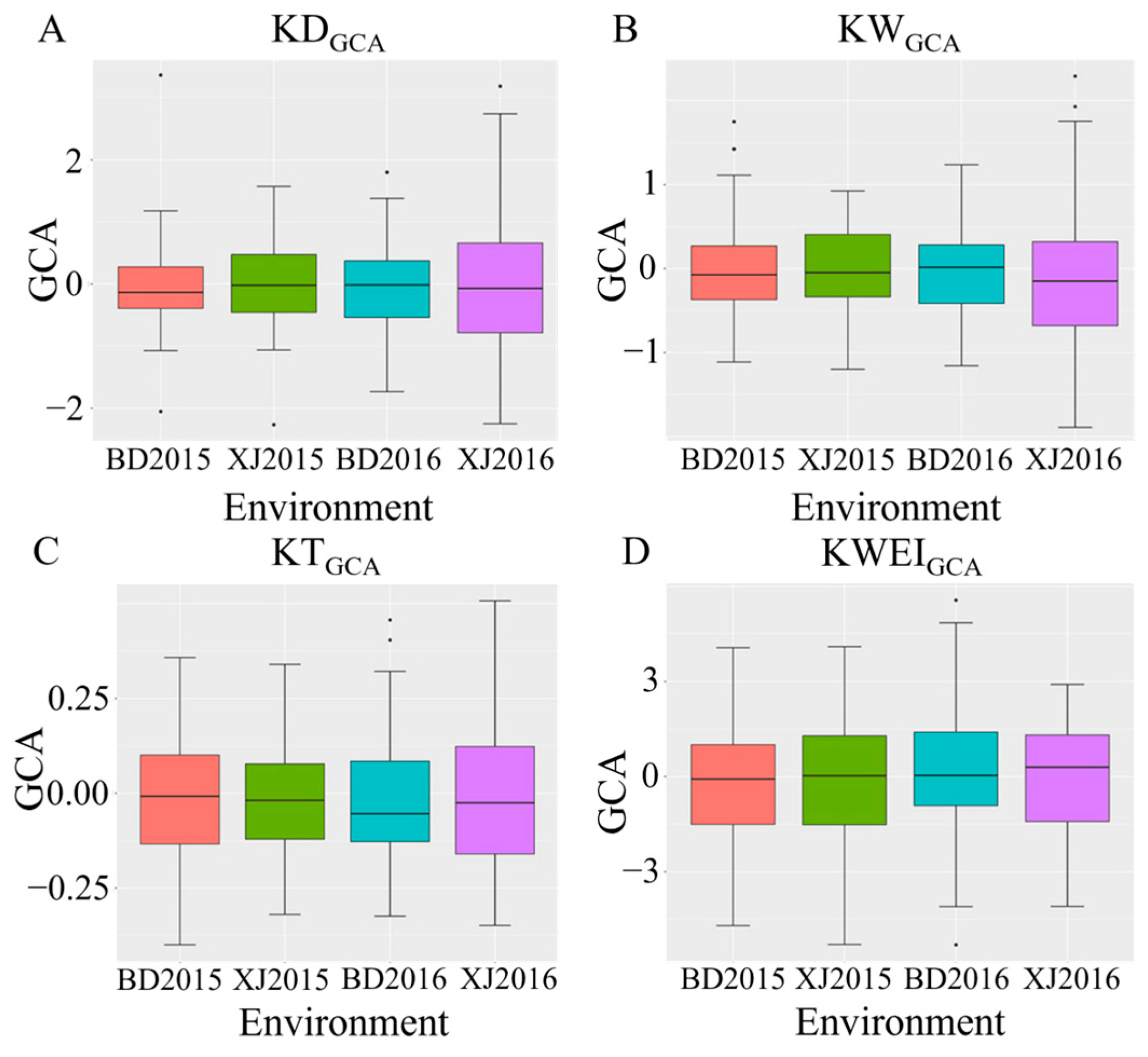 3.1. The Performance of Kernel-Related Traits and GCA Across Environments