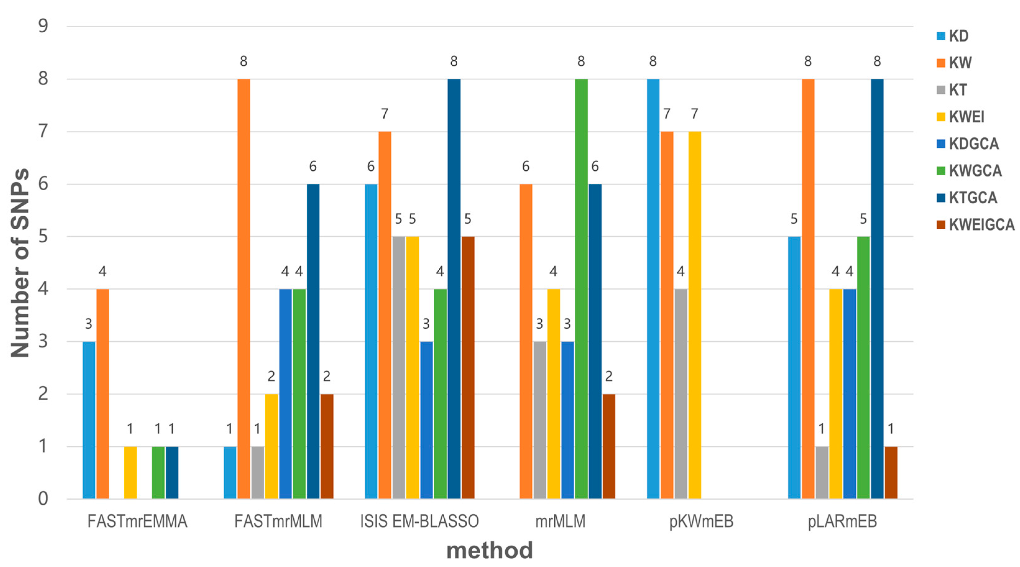 4.3. Comparison of the Detection Effectiveness of Different GWAS Methods