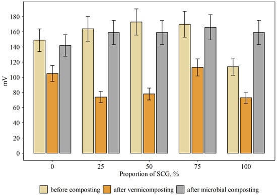 Good aeration was maintained throughout the composting process, creating aerobic conditions for the decomposition of organic matter. RedOx potential levels achieved 142–166 mV for microbial composting (Figure 2). However, for vermicomposting, they were 1.7 times lower (73–113 mV). SCG addition had no noticeable effect on RedOx potential at any concentration.
