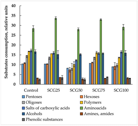 Minor differences in the consumption of substrates of different nominal groups were also observed. These differences were the smallest for amino acids, alcohols, and organic acid salts, with the coefficient of variation in the consumption of these groups ranging from 9 to 13%. For the remaining substrate groups, the coefficient of variation was approximately 20%. It should be noted that the microbial communities with the lowest average cell optical density values demonstrated a significant reduction in the consumption of hexoses, oligosaccharides, and polymers. The reduced ability to consume oligosaccharides and polymers indicates a reduced ability of the studied microbial communities to decompose plant residues. By contrast, composts with 25% and 50% SCG showed the highest polymer and oligosaccharide consumption.