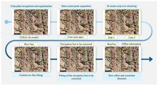 The maize seedling images used in the experiments were acquired at the National Precision Agriculture Research and Demonstration Base in Xiaotangshan, Changping District, Beijing, China, from 1 July to 20 July 2025, between 09:00 and 16:00. The images were captured using a Logitech C930c camera (Logitech Inc., Lausanne, Switzerland) at a resolution of 1920 × 1080. To ensure background complexity and dataset diversity, images were collected under various weather conditions, illumination levels, and growth stages, yielding a total of 1987 images. Maize seedlings in the dataset were annotated as target objects using the LabelImg software (Version 1.8.6), and the images were divided into training, validation, and test sets in a ratio of 8:1:1. Our group developed a deep learning-based algorithm for real-time crop-row recognition and localization of maize in the field [25]. The model trained in this study is a two-class detector designed to distinguish between two categories: “maize” and “non-maize (weed)”. After 100 training epochs, it achieved a precision (P), recall (R), and mean average precision (mAP) of 96.7%, 95.8%, and 96.2%, respectively. Crop-row detection was performed using a segmentation model based on You Only Look Once, version 8, small (YOLOv8s) [26]. The complete workflow of this crop-row detection and correction process is illustrated in Figure 3: Online stem centroids are used as key points; K-means clustering determines the number of rows [27,28]; confidence-weighted least squares fits the left and right crop-row centers [29]; from these two centers a geometric inter-row centerline is constructed, and the lateral offset is obtained by comparison with this centerline. After calibration, the pixel offset is mapped to physical lateral displacement [30]. The recognition-to-command update rate is 3 Hz. The host computer, a Jetson Orin NX (NVIDIA, Santa Clara, CA, USA), communicates with the C37 controller over USB-CAN, using a fixed 16-byte packet to issue row-guidance commands: AA 01 00 08 00 00 00 01 00 05 00 00 00 00 00 00. The frame contains key fields: a header, command ID, direction flag, and offset count, with remaining bytes reserved for extension; 00 denotes left and 01 denotes right, and the offset is encoded as a hexadecimal count. Upon reception, the lower-level controller converts the offset count to a lateral displacement command for the servo-electric cylinder using calibration coefficients and executes it in closed loop, while reporting actual displacement and status, thereby achieving row-guided correction and stable tracking.