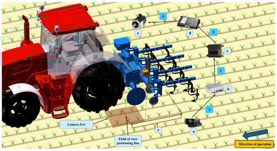 For row-guided inter-row cultivation in maize fields, the implement comprises a network camera (Logitech Inc, Lausanne, Switzerland), an NVIDIA Jetson Orin NX (NVIDIA, Santa Clara, CA, USA), a C37 controller (Heesn Microelectronics Technology Co., Ltd., Suzhou, China), a servo drive (model FD144S-CB-005, Kinco Electric Co., Ltd., Shenzhen, China), and a servo-electric cylinder with a lateral-shift mechanism (model JC804-800-300-71.4-1Kw, Changzhou Jiechuan Electromechanical Equipment Co., Ltd., Changzhou, China). The camera acquires images of multiple maize rows within the FoV, and the Jetson detects stem tips, fits the crop-row lines, and computes the geometric midpoint between adjacent rows to generate the inter-row centerline. The system then computes the lateral deviation e with respect to this centerline. The C37 converts e into a lateral command and, given available lateral travel of ±15 cm (total 30 cm), reserves a 2–3 cm end margin before commanding the servo drive; the cylinder executes the side shift, aligning the cultivation band with the target inter-row centerline in real time. The row spacing S is 50 cm, and the cultivation-band width is 30 cm. During operation, the controller is tuned for robust performance under the constraint of minimal root-zone intrusion, characterized by rapid decay of the lateral deviation and stable tracking of the crop-row centerline, thereby achieving safe coverage and efficient maize inter-row cultivation, as shown in Figure 1.