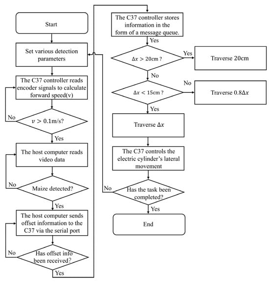 The system detects the two maize plants in real time using the camera, calculates the deviation between them and the current position of the lateral shift mechanism, and then transmits the offset to the C37 controller, as shown in Figure 4. Based on the constant forward speed v of the implement and the fixed distance d between the camera and the cultivator blade, the system calculates the trigger time for the servo-electric cylinder. In this way, when the lateral offset changes, the lateral-shift mechanism can reach the target position in time and with high accuracy. Additionally, in addition to real-time offset calculation, the system must account for various delay factors, including image processing, data transmission, and the response time of the servo-electric cylinder. The time required for lateral shift is calculated in real time, while other delay factors are determined through experimental calibration. Finally, these delays, along with the offset information, are comprehensively calculated to ensure that the lateral shift action is triggered at the precise moment, maintaining operational stability and accuracy. The formula for calculating delays is: