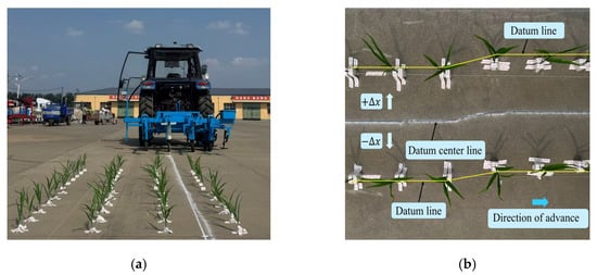 To assess guidance accuracy, lateral positions were derived from the sand trace after the implement passed. Two parallel reference lines were laid along the outer sides of the two simulated rows, and their geometric centerline was taken as the reference centerline. Lateral deviation was defined with respect to the travel direction as positive to the left of the reference centerline and negative to the right. Sampling points were placed every 10 cm along the travel direction, and the opposing plants across the inter-row at each longitudinal position were treated as one sampling pair. At each sampling point, the perpendicular distance from the center of the actual trajectory to the reference centerline was measured, as shown in Figure 6b.
