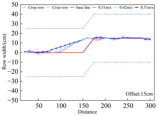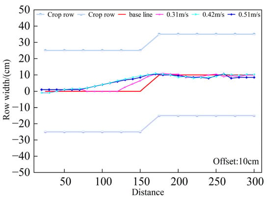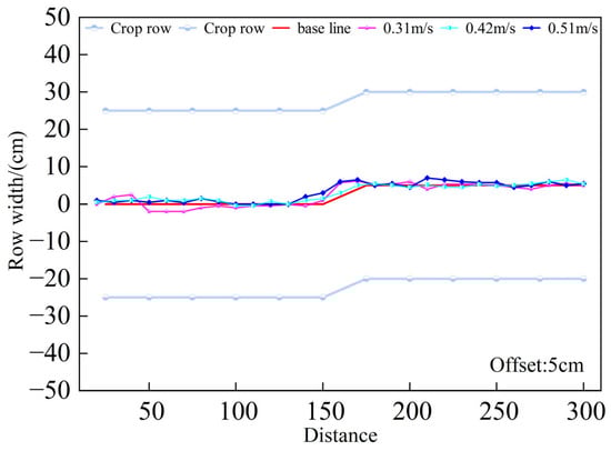 As shown in Figure 9, for a 5 cm preset offset, the inter-row cultivator trajectories at 0.31 m/s, 0.42 m/s, and 0.51 m/s nearly coincided with the reference centerline, with only slight lateral adjustment near the offset initiation point at approximately cm. The three curves nearly overlap, indicating rapid correction and high trajectory stability under small-offset conditions.