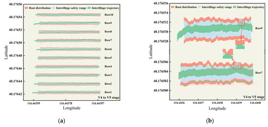 At the V2 to V3 stage, maize roots were mainly distributed in the shallow soil on both sides of the row, with a narrow lateral spread and an overall banded, concentrated pattern (Figure 12a). During this stage, the inter-row cultivator’s trajectory remained near the inter-row centerline and was stable, theoretically within the root-zone safety band. However, the enlarged view (Figure 12b) shows that, due to small deviations in machine motion and surface undulations, portions of the cultivation trajectory already overlapped the root-zone band; the intersection arc lengths for row 5 and row 7 were 13.5 cm and 26 cm, respectively. These results indicate that even at an early growth stage, roots may locally extend into the inter-row corridor, so minor lateral offsets of the cultivation trajectory can still pose a risk of cutting marginal roots.