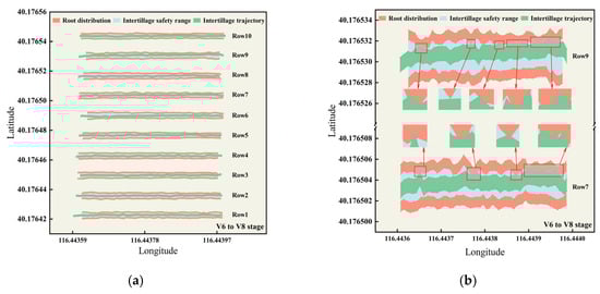 At the V4 to V5 stage, maize roots expanded markedly from both sides into the inter-row corridor, widening the root-zone band and sharply narrowing the root-zone safety band (Figure 13a). The implement trajectory generally remained near the inter-row centerline, but root expansion combined with small lateral offsets produced clear spatial intersections in some rows; the intersection arc lengths were 330.6 cm and 141 cm, respectively (Figure 13b).