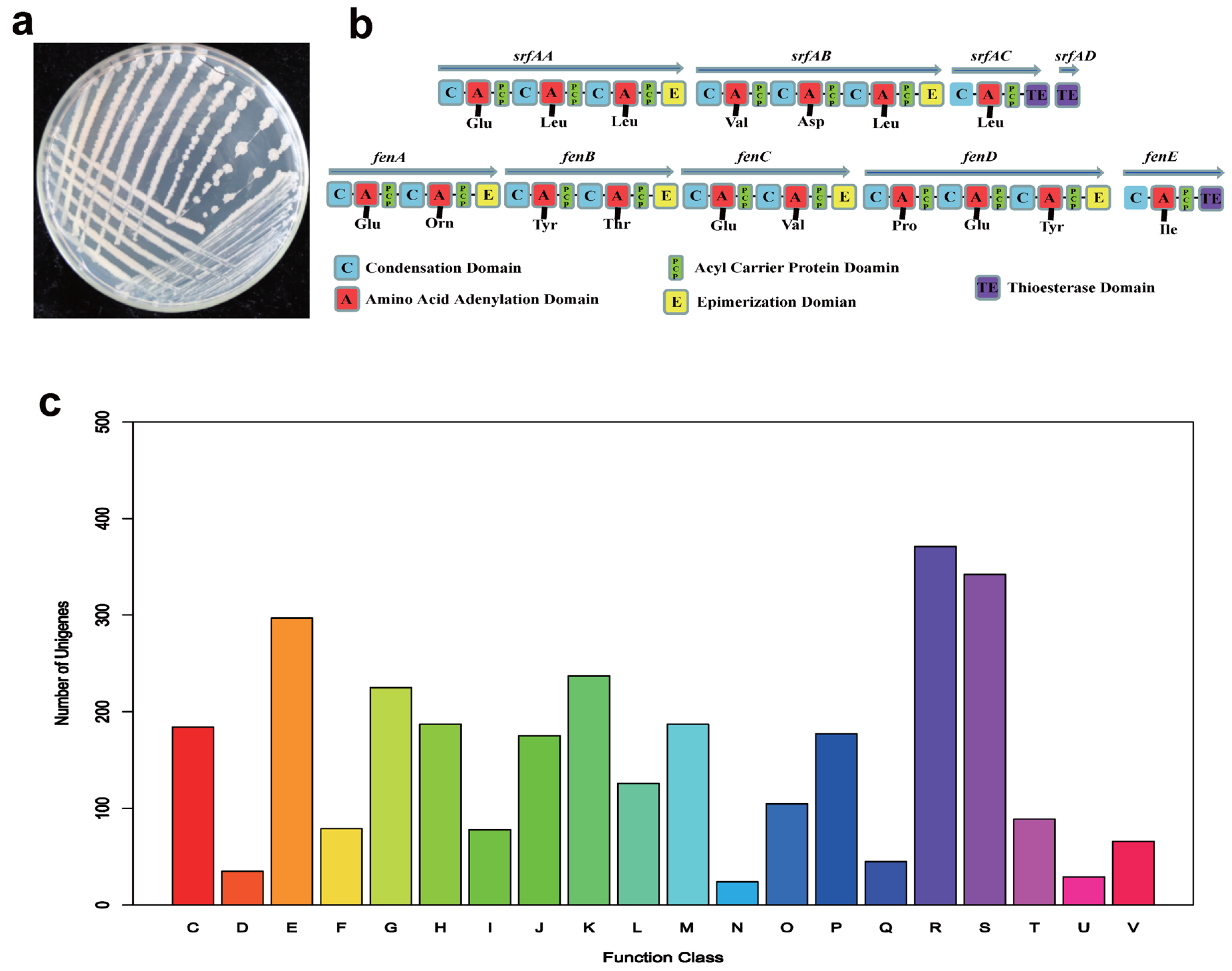 - Zeng, Q.; Xie, J.; Li, Y.; Chen, X.; Gu, X.; Yang, P.; Hu, G.; Wang, Q. Organization, evolution and function of fengycin biosynthesis gene clusters in the Bacillus amyloliquefaciens group. Phytopathol. Res. 2021, 3, 26. [Google Scholar] [CrossRef]