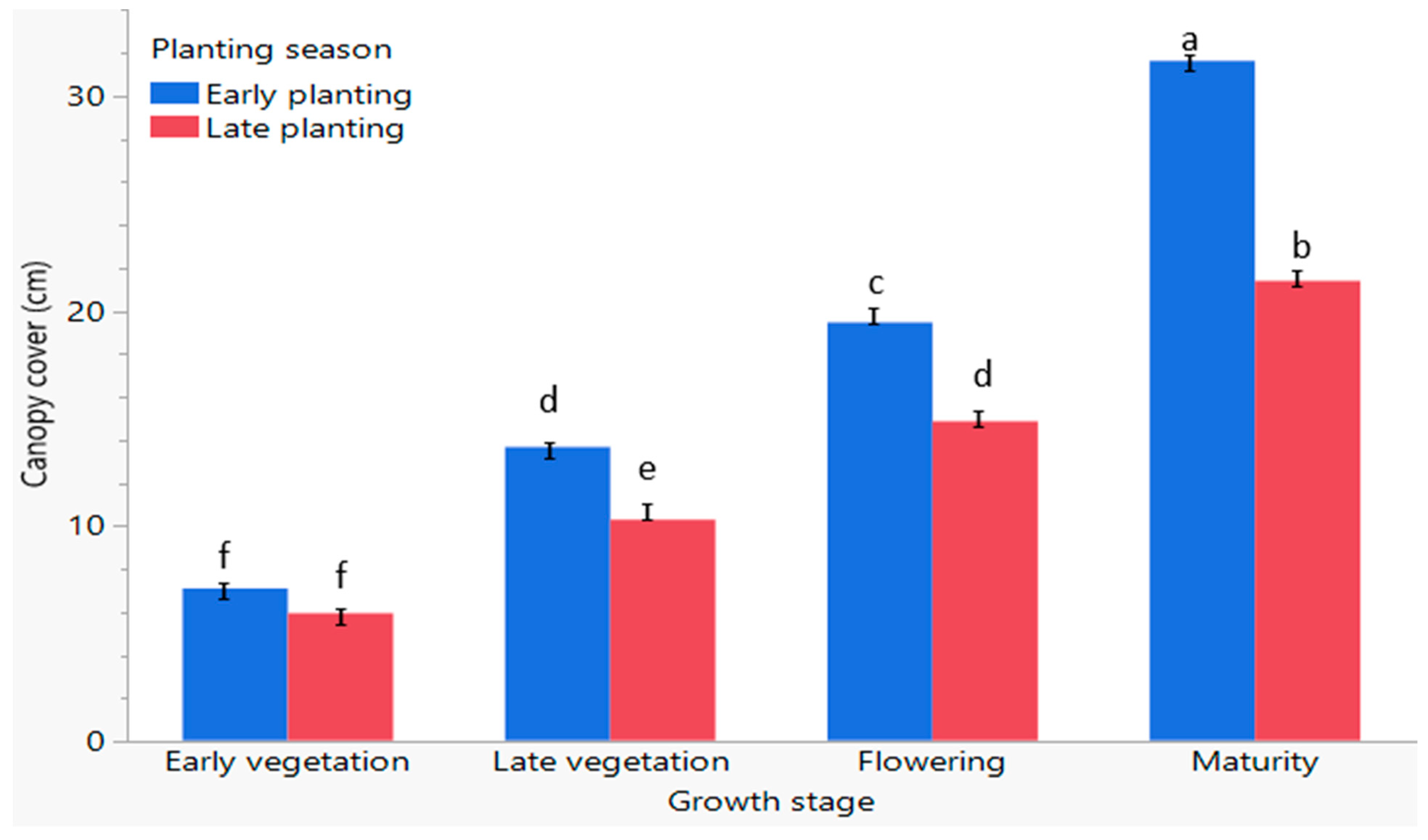 3.7. The Response of the Canopy Cover of the C. sativa Plant to Early and Late Planting Seasons at Different Growth Stages