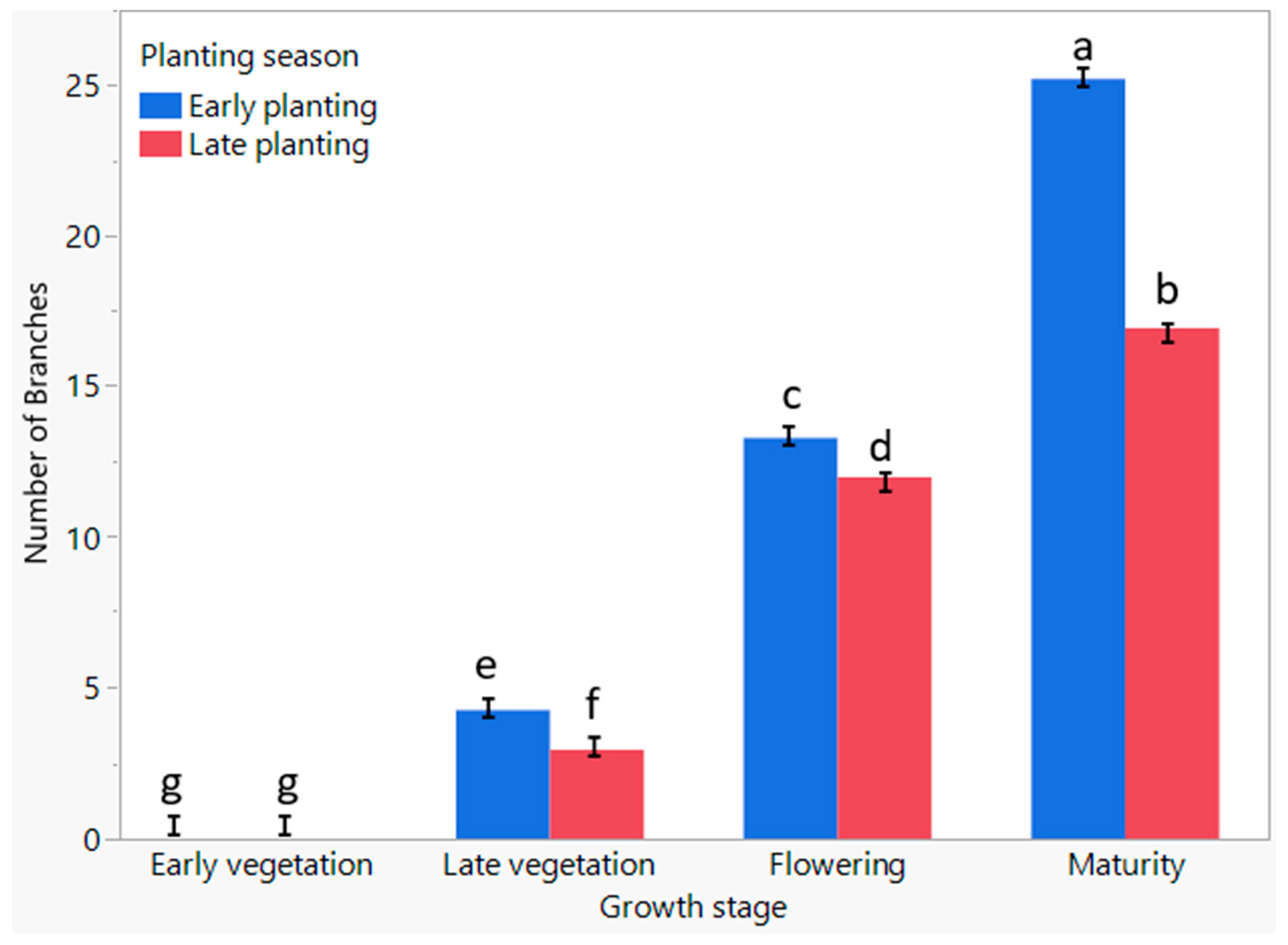 3.8. The Influence of Planting Season on the Number of Branches of C. sativa at Different Growth Stages