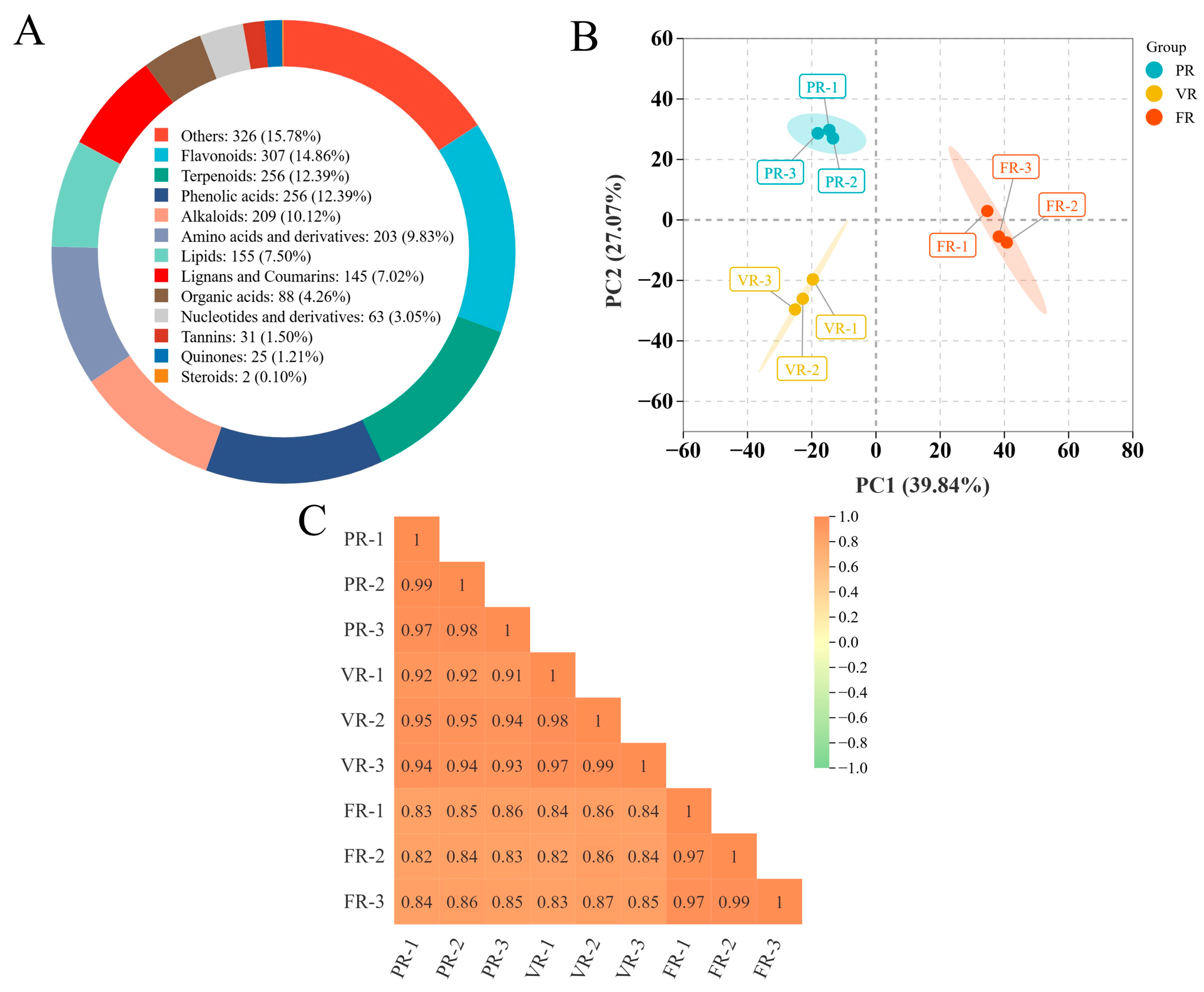 Figure 2B) visually presents the distribution characteristics of the samples in the dimensionality reduction space. The quality control samples are highly concentrated, reflecting the good stability of the experimental system and the controllability of data quality. Samples at differing developmental stages (PR, VR, FR) demonstrate significant spatial separation, while samples within each stage exhibit a closely aggregated state. This distribution pattern not only reveals the metabolic characteristics specific to the developmental stage but also verifies the reliability of biological repetition. Furthermore, an analysis of the correlation coefficient matrix revealed that the mean correlation coefficient of the metabolic profiles of samples within each developmental stage group attained 0.80 (