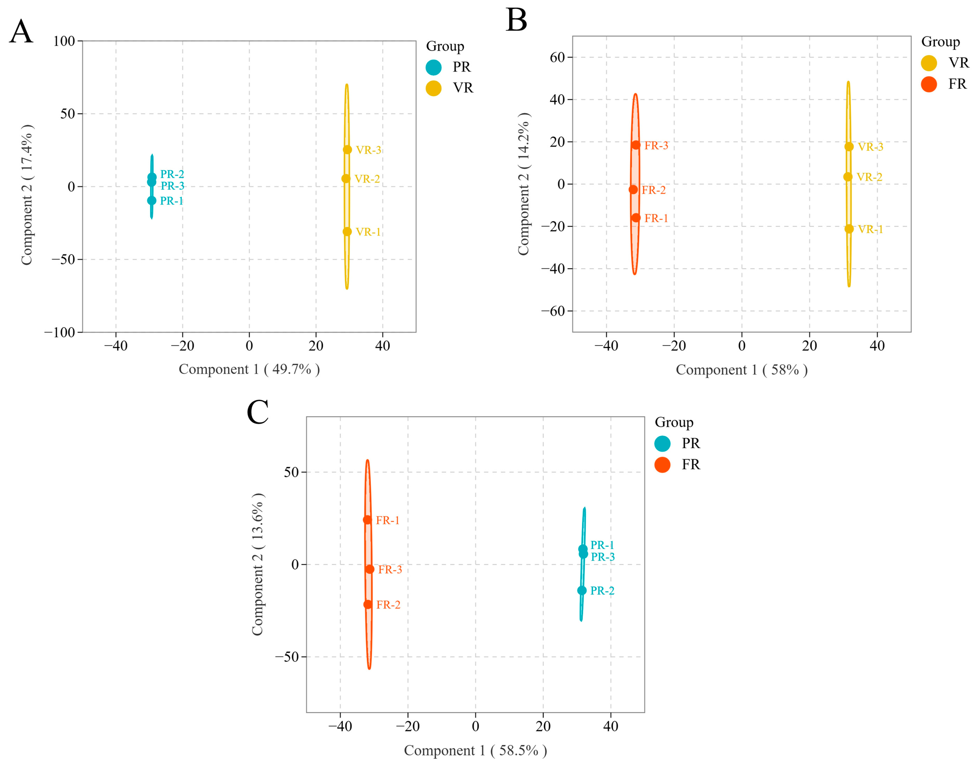 Differential metabolite screening focused on sugars, organic acids, and their immediate derivatives to pinpoint compounds directly linked to the shifting sugar–acid profile. In the differential screening study of sugar acid metabolites, this study employed OPLS-DA to systematically compare the three key developmental stages of PR, VR, and FR. In order to accurately identify differentially expressed metabolites with biological significance, a triple screening criterion has been established. This criterion comprises the following three elements: the absolute value of the folding multiple (FC) of the metabolite abundance change is required to be ≥1; The projected value of variable importance (VIP) in the prediction of the OPLS-DA model is required to be ≥1; The