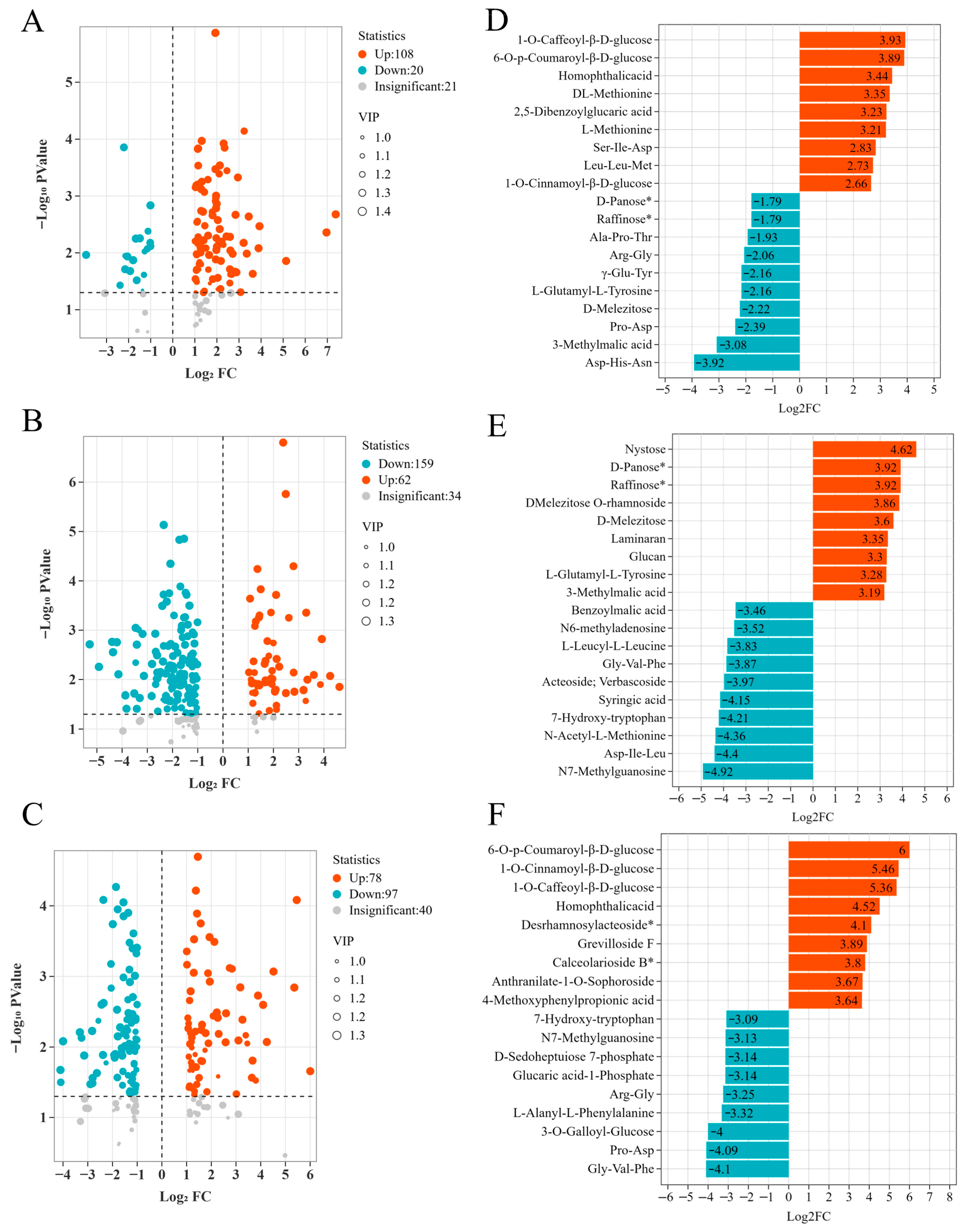 Figure 4D), the top 9 metabolites that were significantly upregulated mainly belonged to two major categories: phenolic acid compounds and amino acids and their derivatives. Among them, Phenolic acid substances include 1-O-Caffeoyl-β-D-glucose (15.22-fold), 6-O-p-Coumaroyl-β-D-glucose (14.79-fold), Homophthalicacid (10.87-fold), and 2, 5-dibenzoylglucar The significant accumulation of substances such as ic acid (9.41-fold) and 1-O-Cinnamoyl-β-D-glucose (6.34-fold) may be closely related to the construction of the antioxidant system and the activation of the secondary metabolic network in the early stage of fruit development; Amino acids and their derivatives include DL-Methionine (10.21-fold), L-Methionine (9.25-fold), Ser-Ile-Asp (7.10-fold), and Leu-Leu-Met (6.63-fold). Its high upregulation indicates that the synthesis of peptide substances related to protein anabolism and signal transduction is relatively active at this stage. Among the top 10 metabolites that were significantly downregulated, the relative contents of three carbohydrate metabolites (Raffinose* and D-Panose*) were all 0.29-fold; although the proportions of D-Melezitose (0.22-fold) and one organic acid (3-Methylmalic acid, 0.12-fold) are low, there may be the consumption of carbohydrate substances and the weakening of organic acid metabolism in the PR to VR stage. The rest are all down-regulation of amino acids and their derivatives. It reflects that the activity of some amino acid metabolic branches was inhibited during this period.