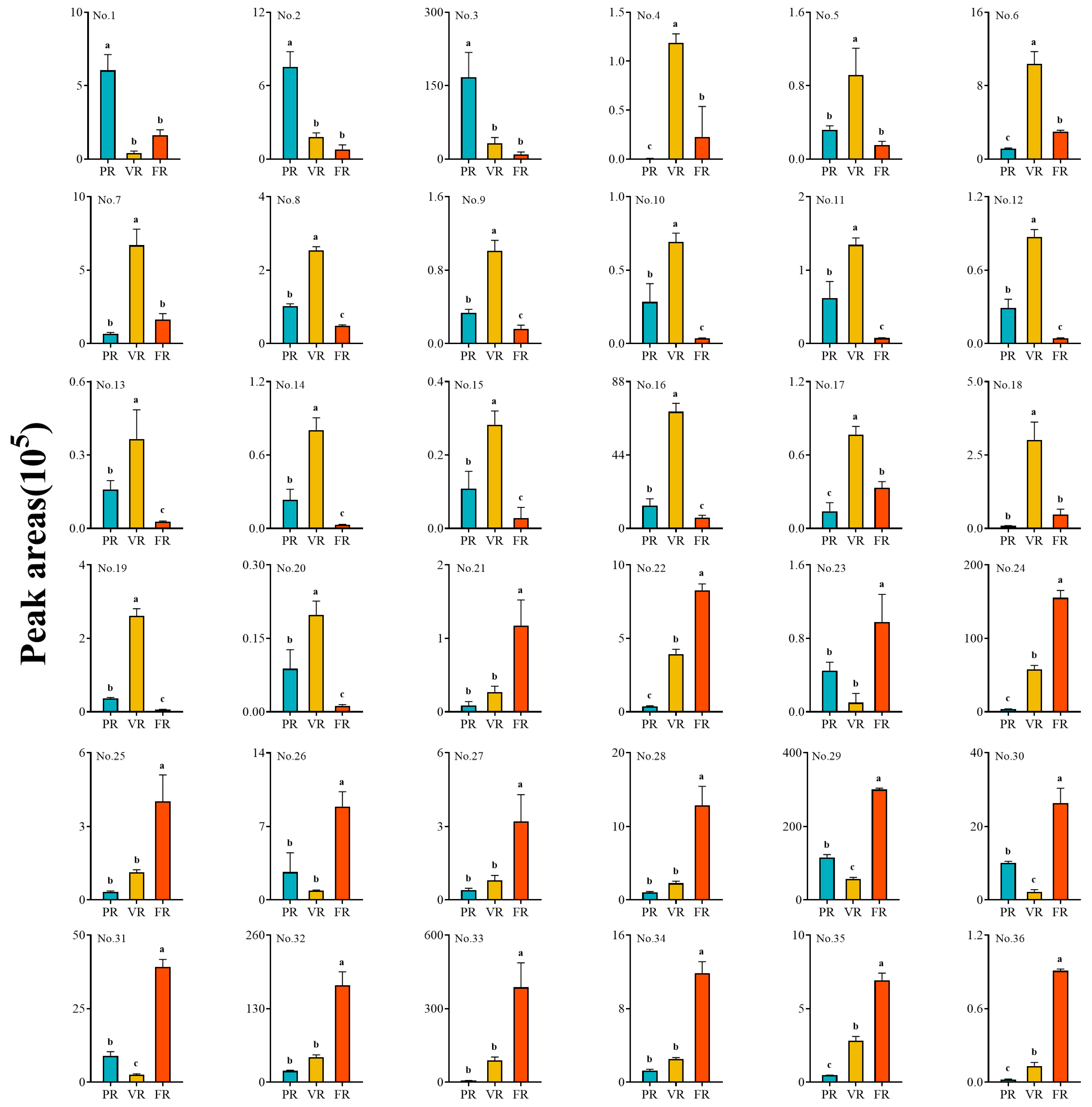 36 in the FR stage is significantly higher than in the PR and VR stages, with phenolic acid compounds dominating (
