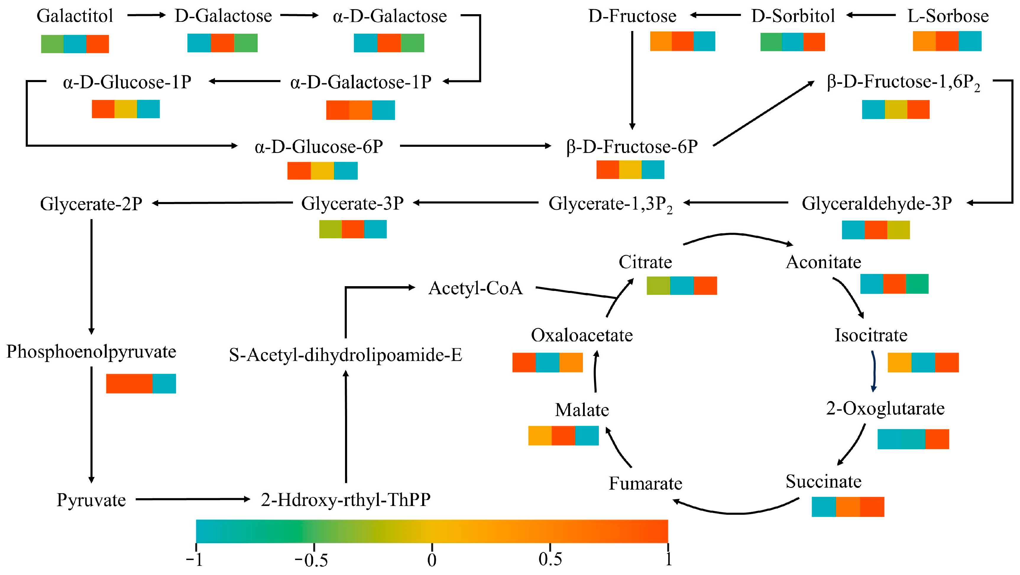 To gain a deeper understanding of how glycolic acid metabolites accumulate differently at various stages of ‘Fengtang’ plums development, we conducted metabolomics analyses on four pathways in the carbon metabolism network: fructose and mannose metabolism, galactose metabolism, glycolysis, and the TCA cycle (