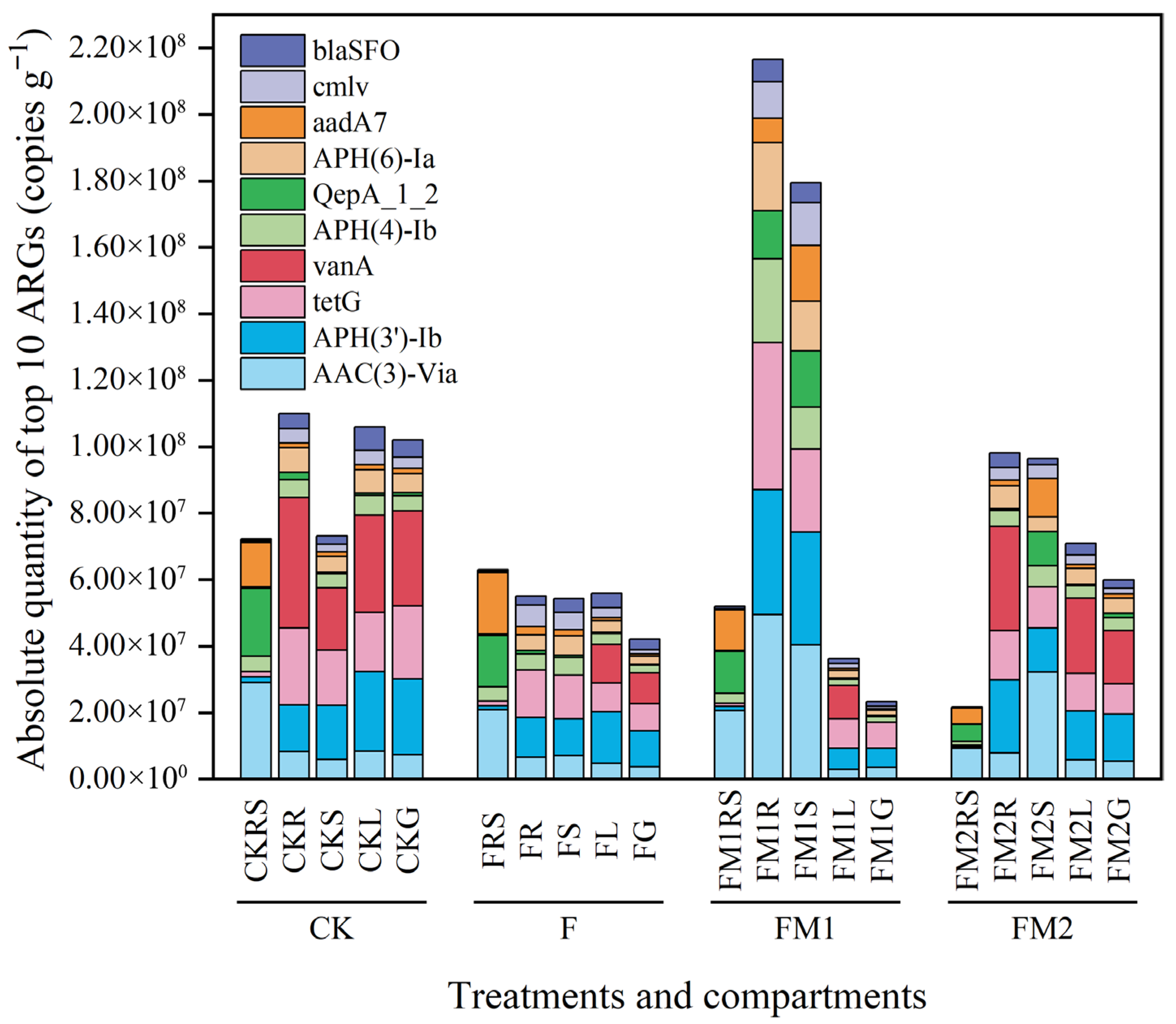 - Zhao, Z.; Luo, B.; Cao, T.; Bai, T.; Sun, Y.; Liu, H.; Zhang, L.; Xie, J.; Wang, J.; Li, H.; et al. Livestock manure-based organic fertilization facilitates the transmission of antibiotic resistance genes across the soil-onion continuum: A significant contribution from root exudates. Soil Biol. Biochem. 2025, 209, 109910. [Google Scholar] [CrossRef]